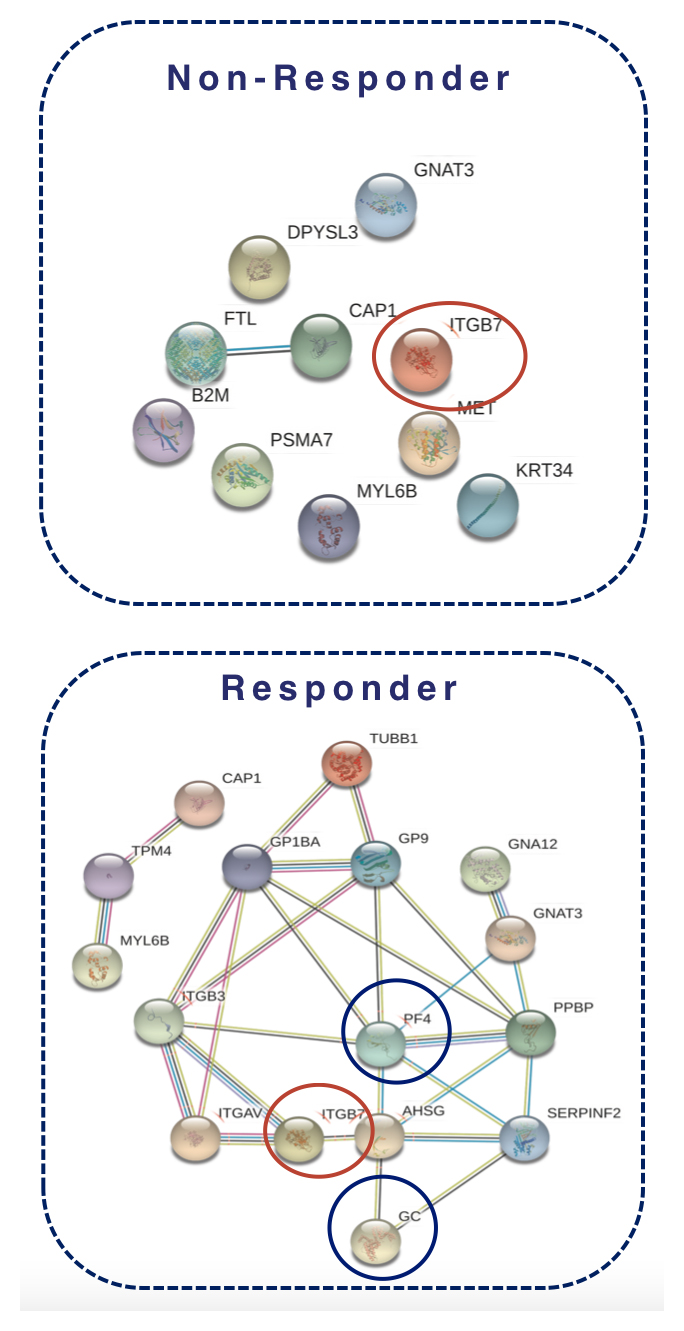 Figure 2. NPOT®-derived protein interaction networks in responder and non-responder PBMC samples following vedolizumab challenge.